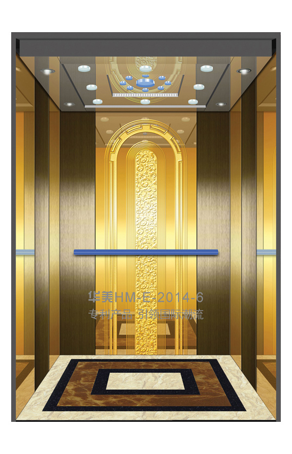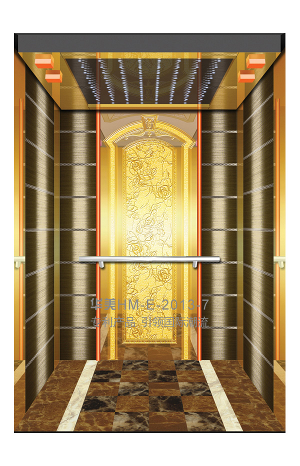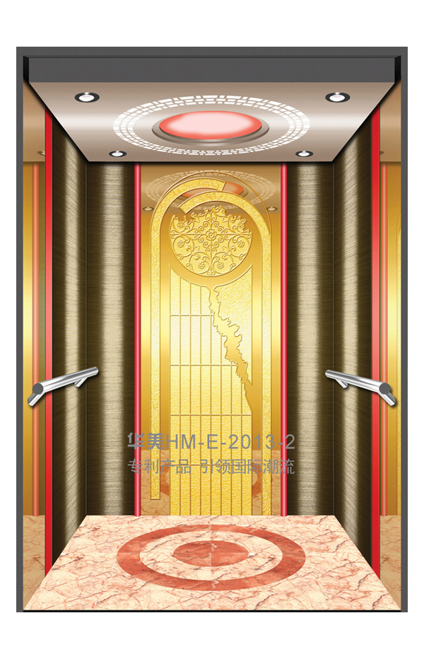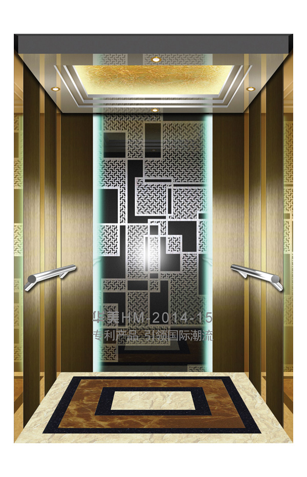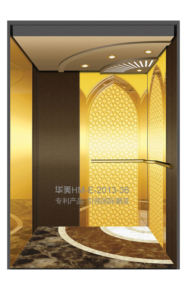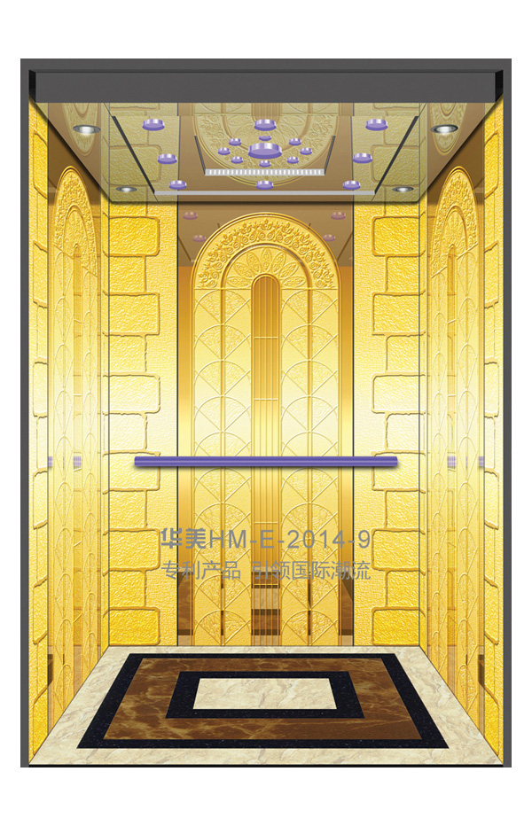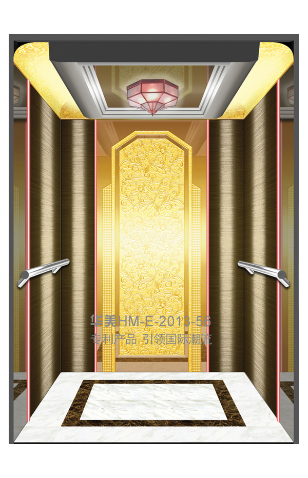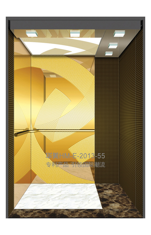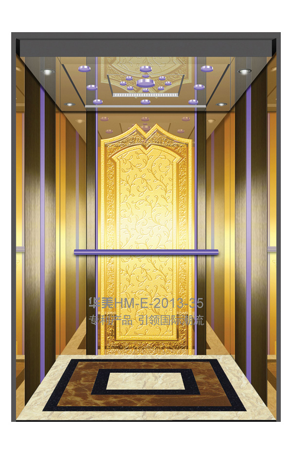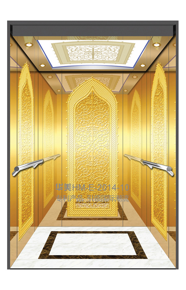 华美全新推出的“浮雕大师”不锈钢艺术轿厢,图案优美,内部更采用了“浮雕大师”工艺,使浮雕面起伏流畅、逼真顺滑、质感超然、金碧辉煌,折射出真金白银的光泽效果,充分体现了浮雕大师与K金的完美结合,极具欣赏价值。且其浮雕面具有耐摩擦、抗指纹、易清洗等优点,是引领国际潮流的专利新产品,创造了全新的艺术境界。