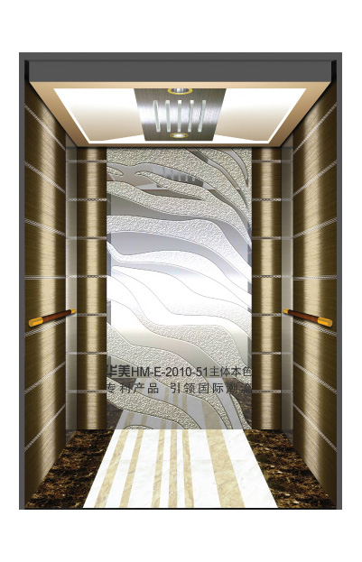 华美全新推出的“浮雕大师”不锈钢艺术轿厢,图案优美,内部更采用了“浮雕大师”工艺,使浮雕面起伏流畅、逼真顺滑、质感超然、金碧辉煌,折射出真金白银的光泽效果,充分体现了浮雕大师与K金的完美结合,极具欣赏价值。且其浮雕面具有耐摩擦、抗指纹、易清洗等优点,是引领国际潮流的专利新产品,创造了全新的艺术境界。