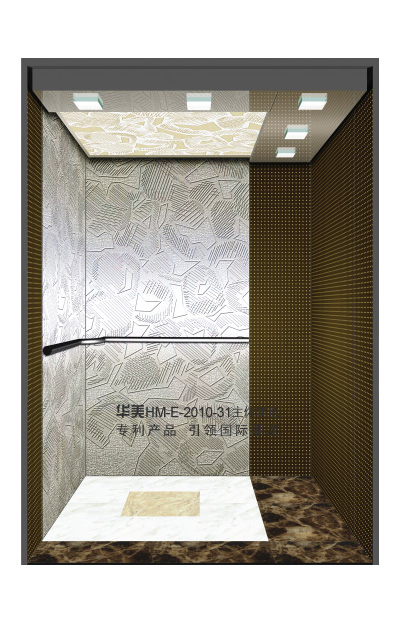 华美全新推出的“浮雕大师”不锈钢艺术轿厢,图案优美,内部更采用了“浮雕大师”工艺,使浮雕面起伏流畅、逼真顺滑、质感超然、金碧辉煌,折射出真金白银的光泽效果,充分体现了浮雕大师与K金的完美结合,极具欣赏价值。且其浮雕面具有耐摩擦、抗指纹、易清洗等优点,是引领国际潮流的专利新产品,创造了全新的艺术境界。