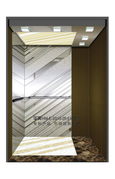 华美全新推出的“浮雕大师”不锈钢艺术轿厢,图案优美,内部更采用了“浮雕大师”工艺,使浮雕面起伏流畅、逼真顺滑、质感超然、金碧辉煌,折射出真金白银的光泽效果,充分体现了浮雕大师与K金的完美结合,极具欣赏价值。且其浮雕面具有耐摩擦、抗指纹、易清洗等优点,是引领国际潮流的专利新产品,创造了全新的艺术境界。