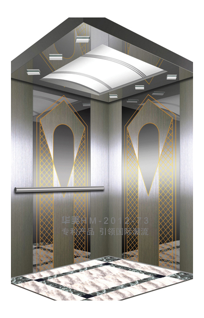 华美全新推出的“浮雕大师”不锈钢艺术轿厢,图案优美,内部更采用了“浮雕大师”工艺,使浮雕面起伏流畅、逼真顺滑、质感超然、金碧辉煌,折射出真金白银的光泽效果,充分体现了浮雕大师与K金的完美结合,极具欣赏价值。且其浮雕面具有耐摩擦、抗指纹、易清洗等优点,是引领国际潮流的专利新产品,创造了全新的艺术境界。