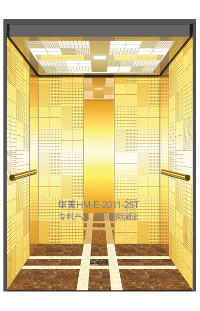 华美全新推出的“浮雕大师”不锈钢艺术轿厢,图案优美,内部更采用了“浮雕大师”工艺,使浮雕面起伏流畅、逼真顺滑、质感超然、金碧辉煌,折射出真金白银的光泽效果,充分体现了浮雕大师与K金的完美结合,极具欣赏价值。且其浮雕面具有耐摩擦、抗指纹、易清洗等优点,是引领国际潮流的专利新产品,创造了全新的艺术境界。