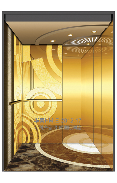 华美全新推出的“浮雕大师”不锈钢艺术轿厢,图案优美,内部更采用了“浮雕大师”工艺,使浮雕面起伏流畅、逼真顺滑、质感超然、金碧辉煌,折射出真金白银的光泽效果,充分体现了浮雕大师与K金的完美结合,极具欣赏价值。且其浮雕面具有耐摩擦、抗指纹、易清洗等优点,是引领国际潮流的专利新产品,创造了全新的艺术境界。