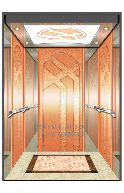 华美全新推出的“浮雕大师”不锈钢艺术轿厢,图案优美,内部更采用了“浮雕大师”工艺,使浮雕面起伏流畅、逼真顺滑、质感超然、金碧辉煌,折射出真金白银的光泽效果,充分体现了浮雕大师与K金的完美结合,极具欣赏价值。且其浮雕面具有耐摩擦、抗指纹、易清洗等优点,是引领国际潮流的专利新产品,创造了全新的艺术境界。