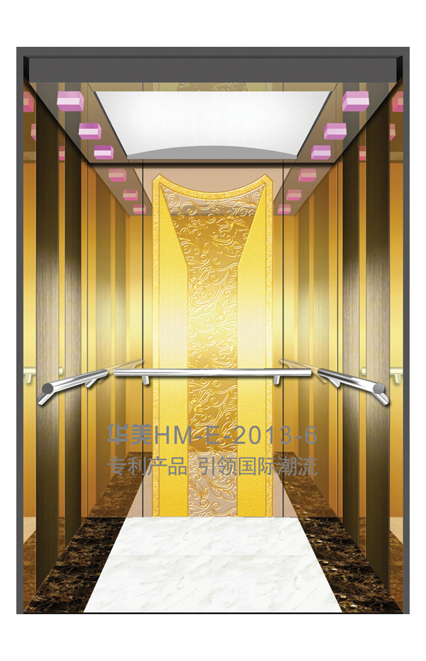 华美全新推出的“浮雕大师”不锈钢艺术轿厢,图案优美,内部更采用了“浮雕大师”工艺,使浮雕面起伏流畅、逼真顺滑、质感超然、金碧辉煌,折射出真金白银的光泽效果,充分体现了浮雕大师与K金的完美结合,极具欣赏价值。且其浮雕面具有耐摩擦、抗指纹、易清洗等优点,是引领国际潮流的专利新产品,创造了全新的艺术境界。