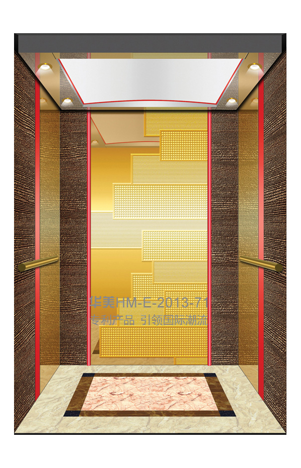 华美全新推出的“浮雕大师”不锈钢艺术轿厢,图案优美,内部更采用了“浮雕大师”工艺,使浮雕面起伏流畅、逼真顺滑、质感超然、金碧辉煌,折射出真金白银的光泽效果,充分体现了浮雕大师与K金的完美结合,极具欣赏价值。且其浮雕面具有耐摩擦、抗指纹、易清洗等优点,是引领国际潮流的专利新产品,创造了全新的艺术境界。