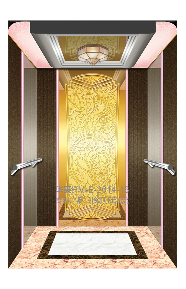 华美全新推出的“浮雕大师”不锈钢艺术轿厢,图案优美,内部更采用了“浮雕大师”工艺,使浮雕面起伏流畅、逼真顺滑、质感超然、金碧辉煌,折射出真金白银的光泽效果,充分体现了浮雕大师与K金的完美结合,极具欣赏价值。且其浮雕面具有耐摩擦、抗指纹、易清洗等优点,是引领国际潮流的专利新产品,创造了全新的艺术境界。