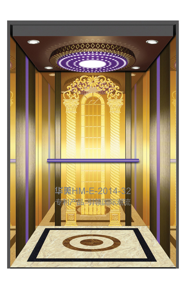 华美全新推出的“浮雕大师”不锈钢艺术轿厢,图案优美,内部更采用了“浮雕大师”工艺,使浮雕面起伏流畅、逼真顺滑、质感超然、金碧辉煌,折射出真金白银的光泽效果,充分体现了浮雕大师与K金的完美结合,极具欣赏价值。且其浮雕面具有耐摩擦、抗指纹、易清洗等优点,是引领国际潮流的专利新产品,创造了全新的艺术境界。