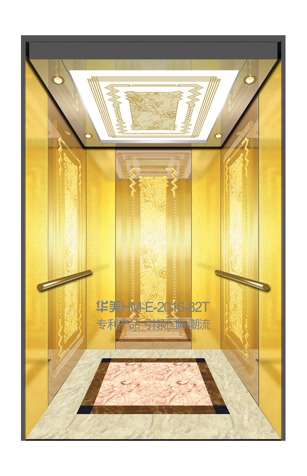 华美全新推出的“浮雕大师”不锈钢艺术轿厢,图案优美,内部更采用了“浮雕大师”工艺,使浮雕面起伏流畅、逼真顺滑、质感超然、金碧辉煌,折射出真金白银的光泽效果,充分体现了浮雕大师与K金的完美结合,极具欣赏价值。且其浮雕面具有耐摩擦、抗指纹、易清洗等优点,是引领国际潮流的专利新产品,创造了全新的艺术境界。